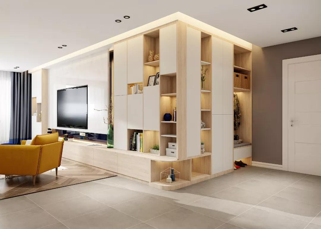 ▲玄关柜和电视柜连在一起,转角做成了弧形,没了一道棱角,安全又美观
