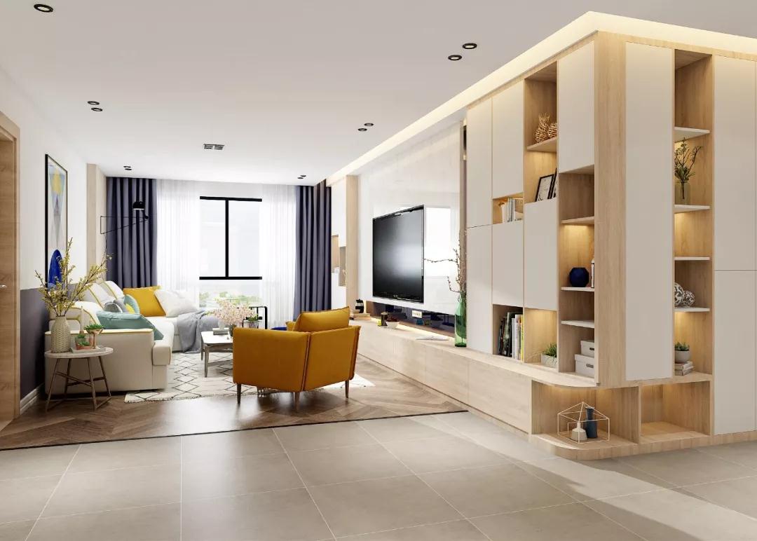 玄关进来右手边就是客厅,因为客厅阳台朝向东,虽然早上阳光好,但是下午会偏暗,所以沙发和电视墙都用了偏亮的色调。