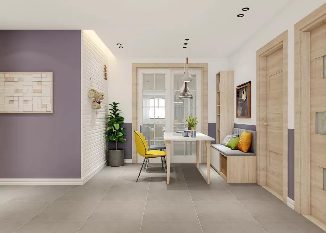 从客餐厅看玄关,原本墙面都是白色的,但业主想要有眼前一亮的感觉,考虑再三后,我们把墙刷成了紫色,发现没有很土,效果还意外好看。