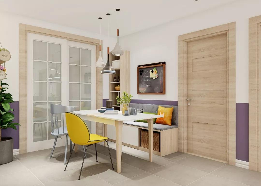 餐厅的护墙也用了紫色调,和卡座灰色的靠垫搭配,亮度虽然下降,但并不暗沉,和偏亮的餐桌椅对比相得益彰。
