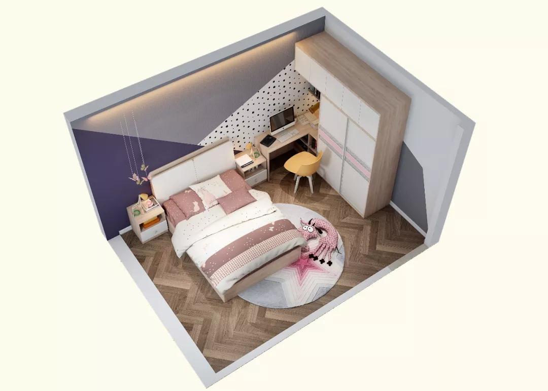 儿童房是女孩住的,使用单一的色调会让小孩子觉得沉闷,所以色调尽量丰富。
