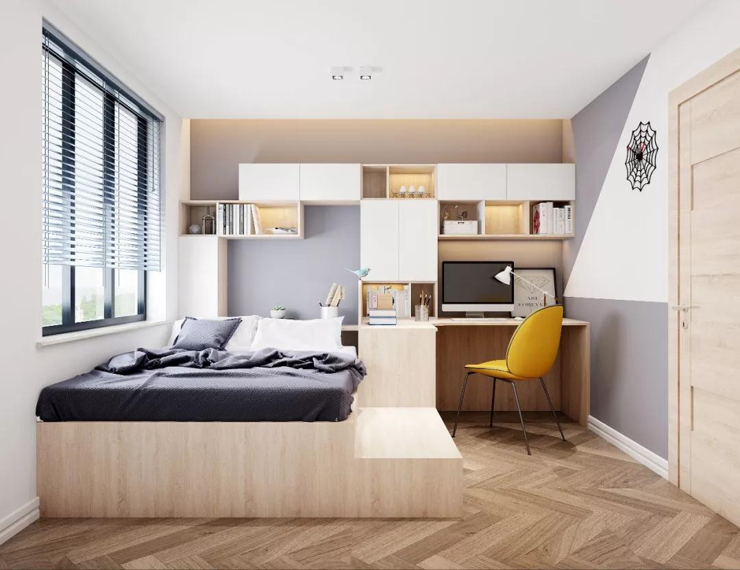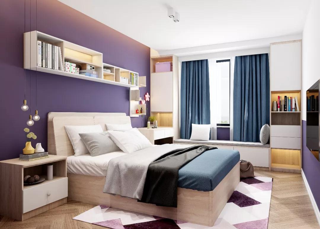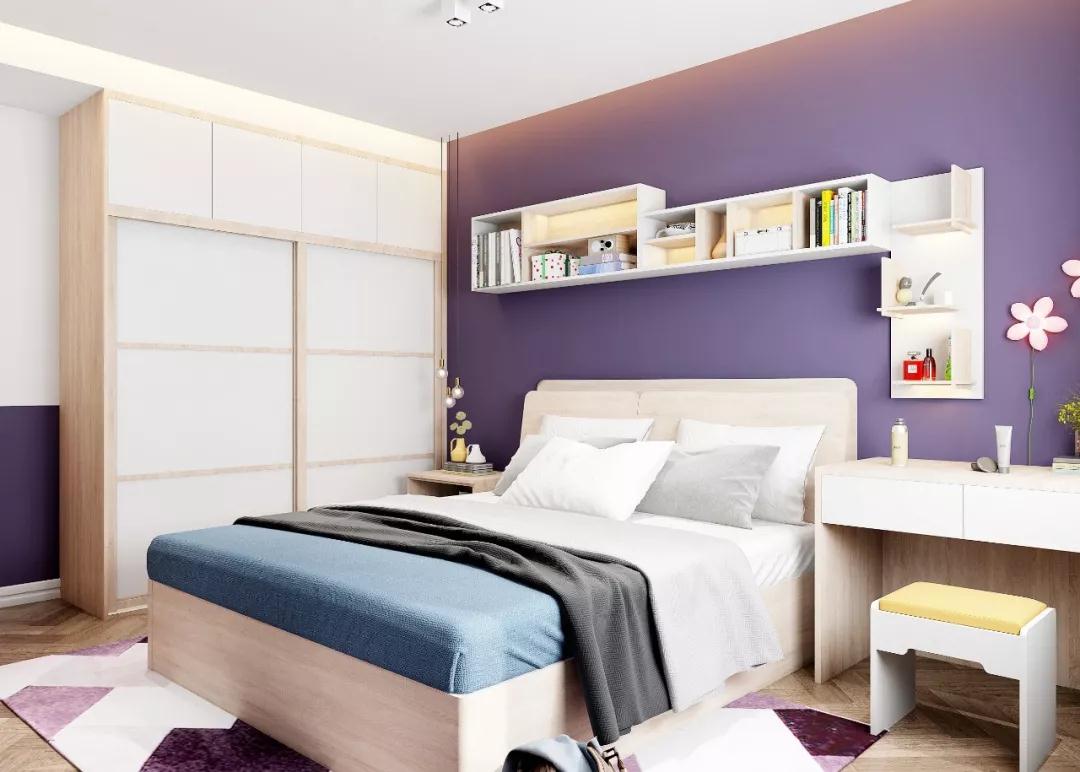 主卧的色调和客餐厅一致,但紫色在小空间运用更有挑战性。