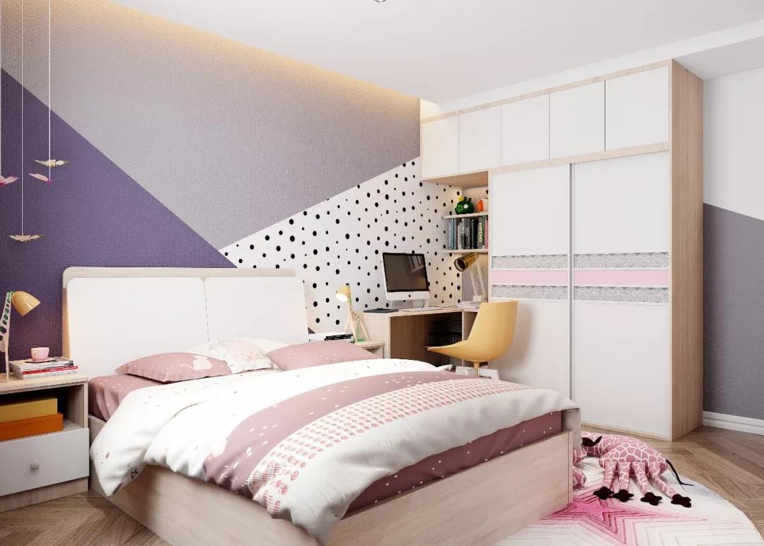 跟主卧不同,紫色在这里不再是唯一的主角,地毯设计了粉色、床品是豆沙色,墙面还搭配了灰色和波点黑,颜色的碰撞个孩子更多想象的空间和活力。