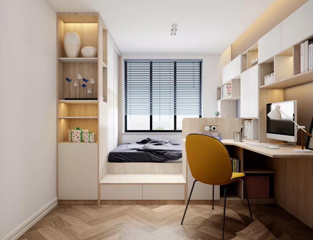 榻榻米用的是和书桌一体的设计,空间利用率高,平时业主也可以到这工作休息,加上窗户大采光好,整个空间显得敞亮。