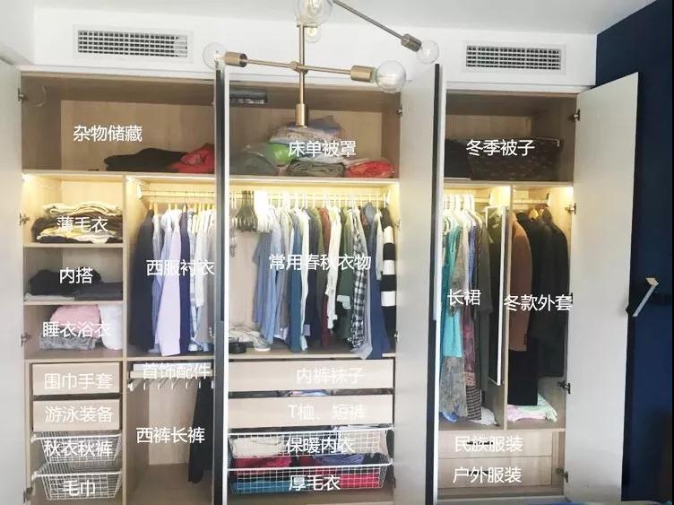 四季天气不同,我们穿的衣服也不同:短袖、毛衣、牛仔裤、呢子大衣… …各式各样的衣服有不同的收纳方法,比如呢子大衣和连衣裙适合悬挂起来,针织衫适合折叠等,衣柜布局也就基本确定下来了:必备功能区(悬挂区、折叠区、床品收纳区、抽屉区、隔板区)+非必备功能区(裤架区、鞋区、首饰区、换洗衣物区、镜子、灯带)