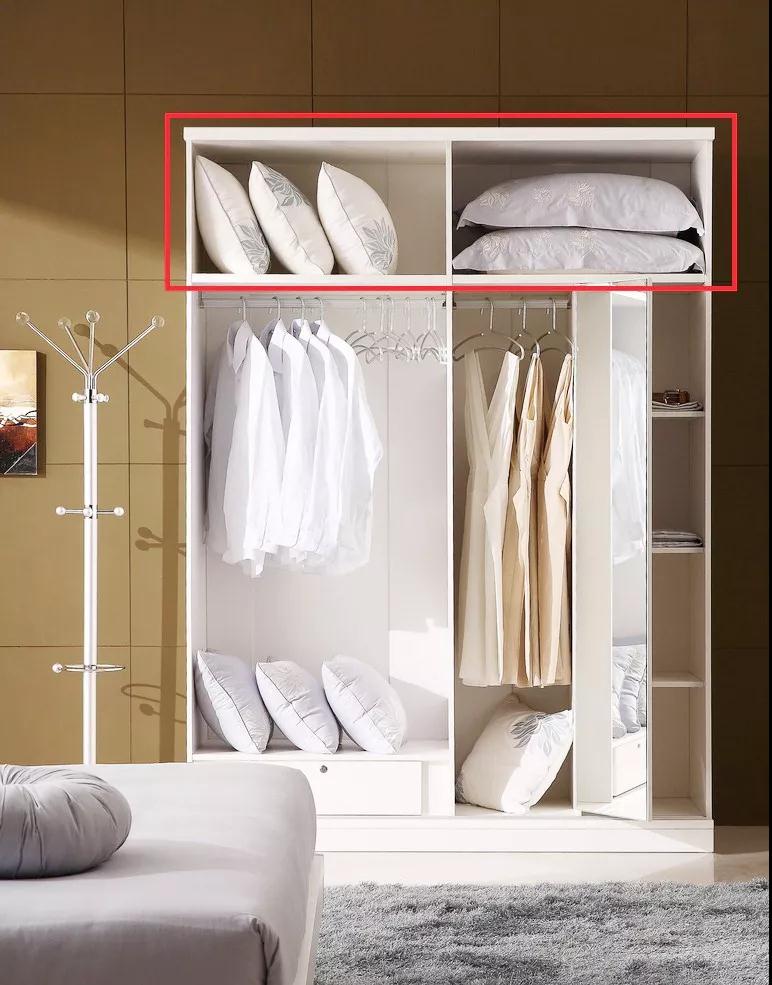 换季时候的被褥收纳也是一个大问题。一般都是将不常用的衣柜上部区域作为床品收纳区。