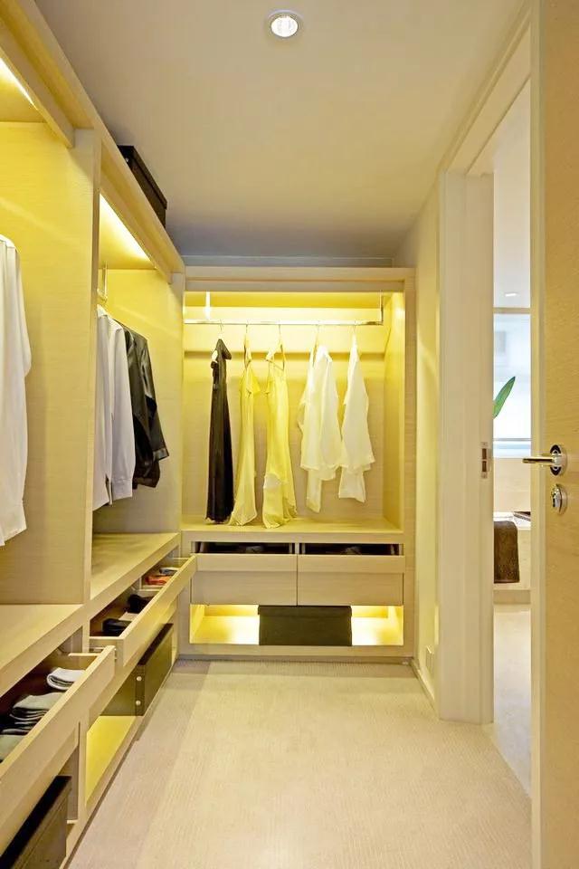 很多时候,衣柜被翻乱是因为找不到衣服,在衣柜中安装几条感应灯带,一目了然,更方便寻找衣物。