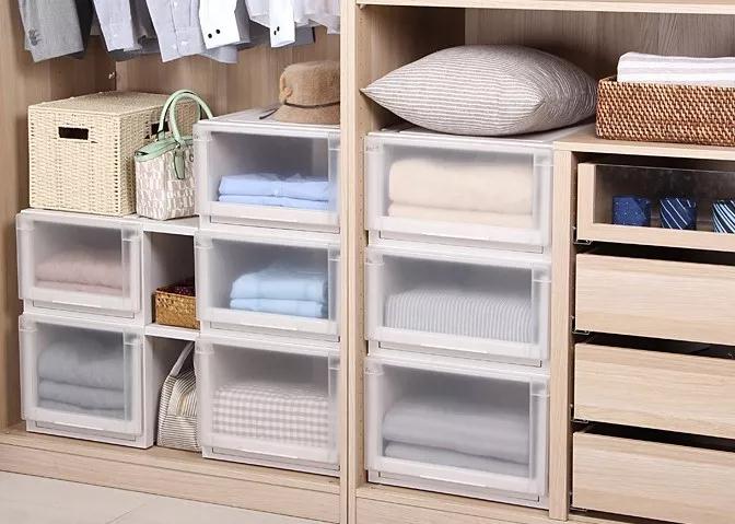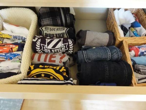 还可以将需要折叠的短袖、毛衣放到抽屉里,不过推荐大家将衣服竖着放置,既减少了衣服被压出的褶皱,拿取的时候也不会搞乱。