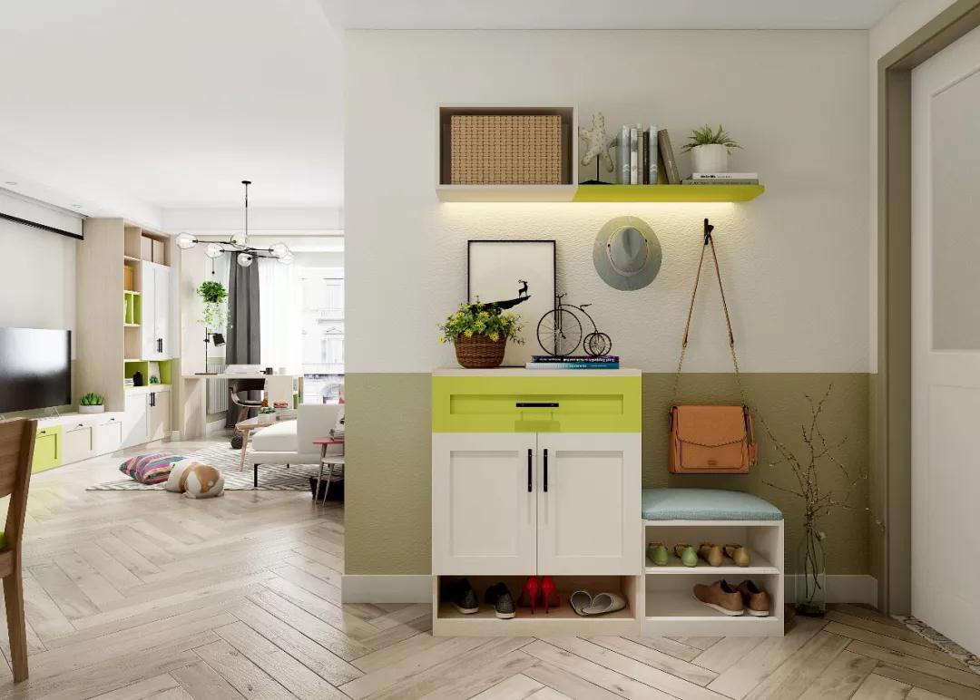 业主在改造前提出,进门要有眼前一亮的感觉。我们选择在进门这堵墙上做功夫,开放式层板和中高柜组合,简单不压抑,清新绿是舒服和个性的表达。