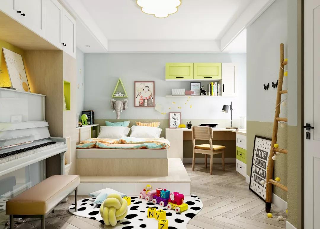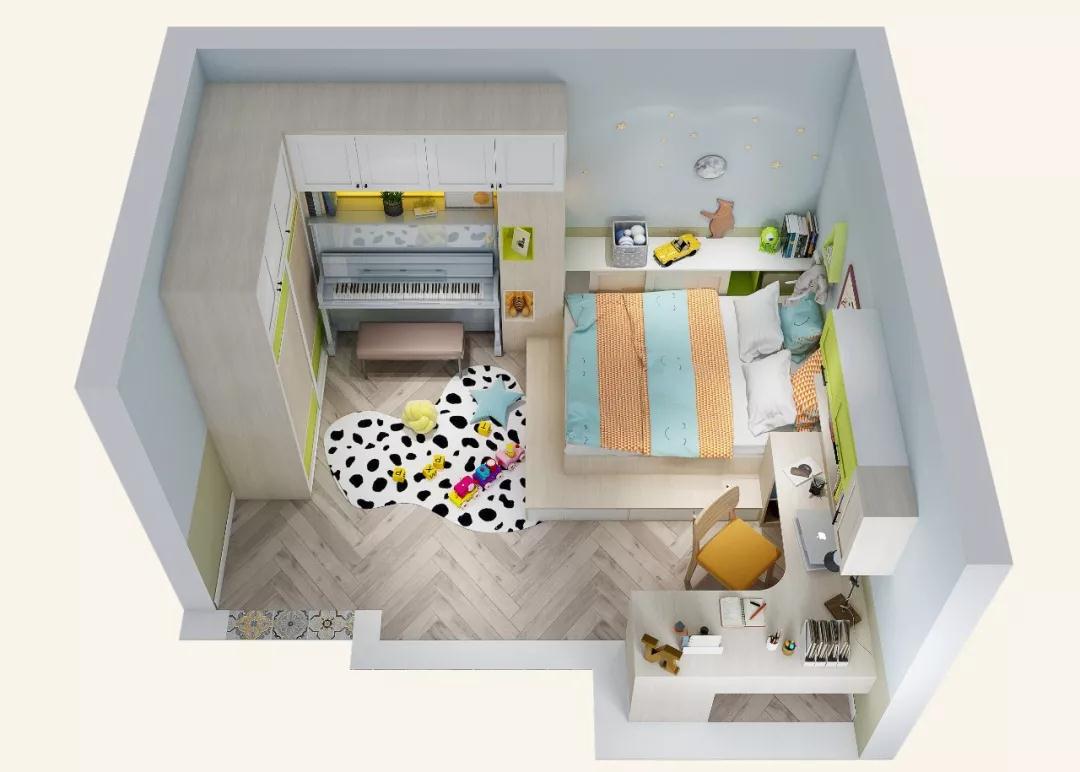 业主的儿子多才又爱玩,儿童房要有开阔的玩乐空间,还要能放下钢琴和书桌。
