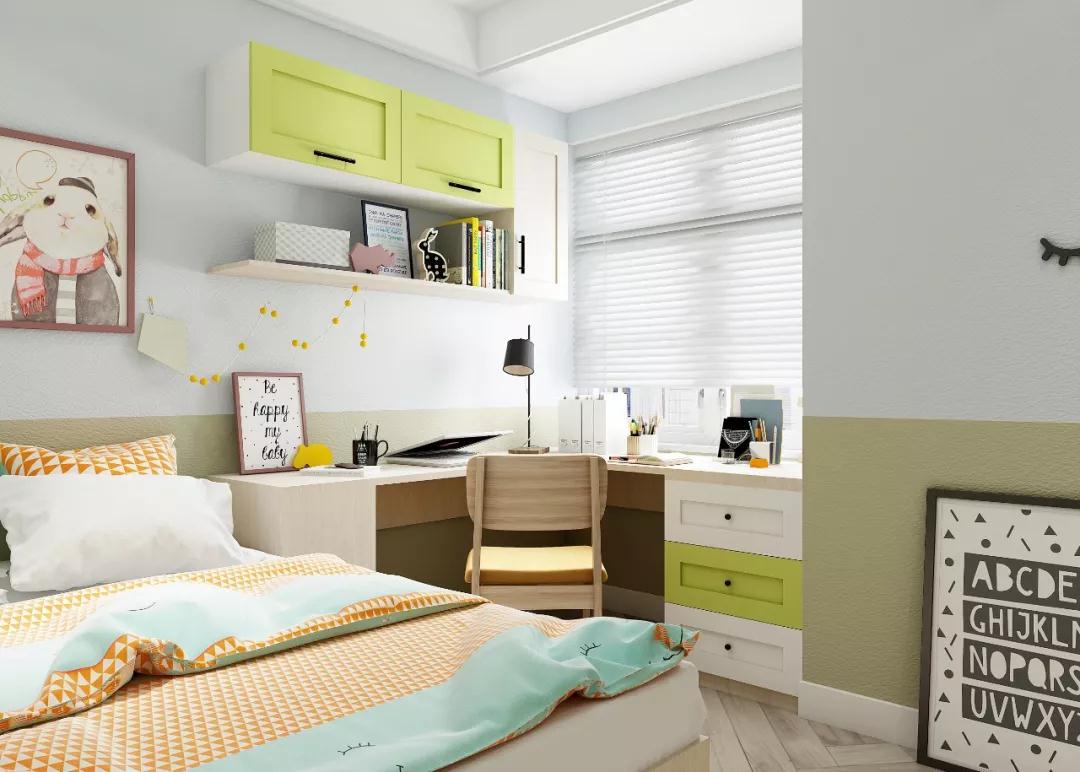 房间采光最好的地方是孩子的学习桌,L型的桌子比较大,孩子随着年龄增长也不必担心不够用。
